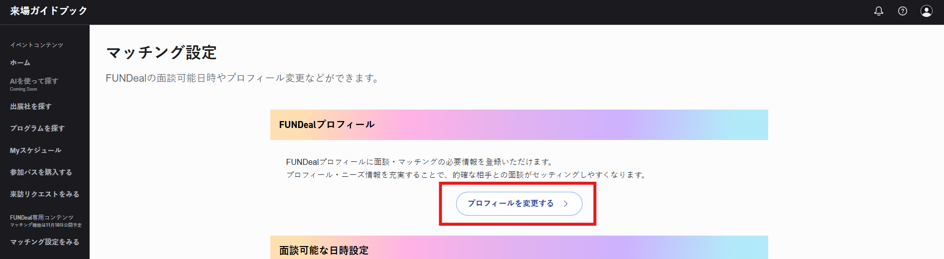 FUNDealプロフィールを編集する 最終更新:2025年11月04日 10:12 編集方法についてFUNDealプロフィールは、来場ガイドブック内、「FUNDealプロフィール作成」より編集いただけます。STEP 1 来場ガイドブックにアクセスする来場ガイドブック にアクセスしてください。STEP 2 「マッチング設定をみる」をクリックSTEP 3 「プロフィールを変更する」をクリックSTEP 4 変更箇所を修正し「登録してホームへ」をクリック 関連記事 面談のキャンセルをする 面談マッチングとは 面談リクエストを送る イベントに申込む ~ Eightに登録済みの方向け ~ FUNDealプロフィールを作成する