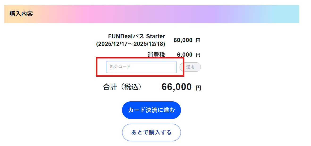 ※「FUNDealパスの選択」でいずれかのパスを選択しないと紹介コード入力欄が表示されません。