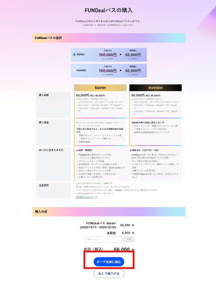 ※「FUNDealパスの選択」でいずれかのパスを選択しないと「カード決済に進む」または「購入する」ボタンが表示されません。