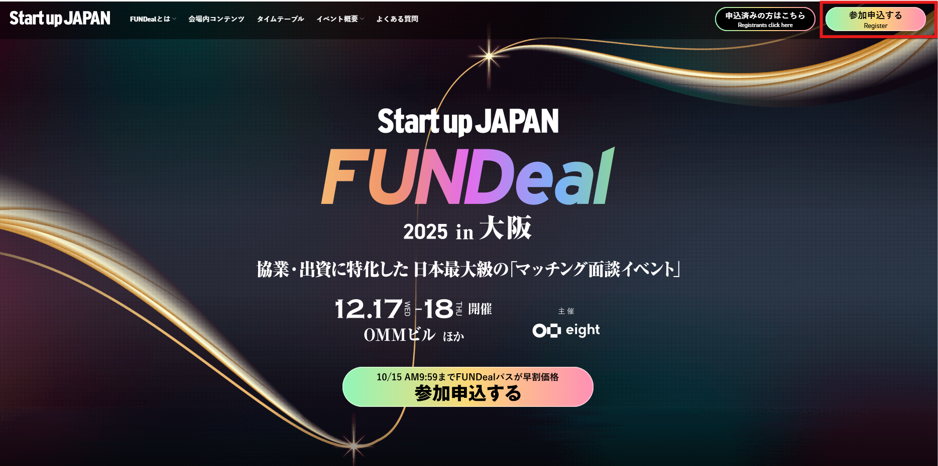 Startup JAPAN FUNDeal 2025 in 大阪 公式サイトの「参加申込する」ボタンをクリックします。