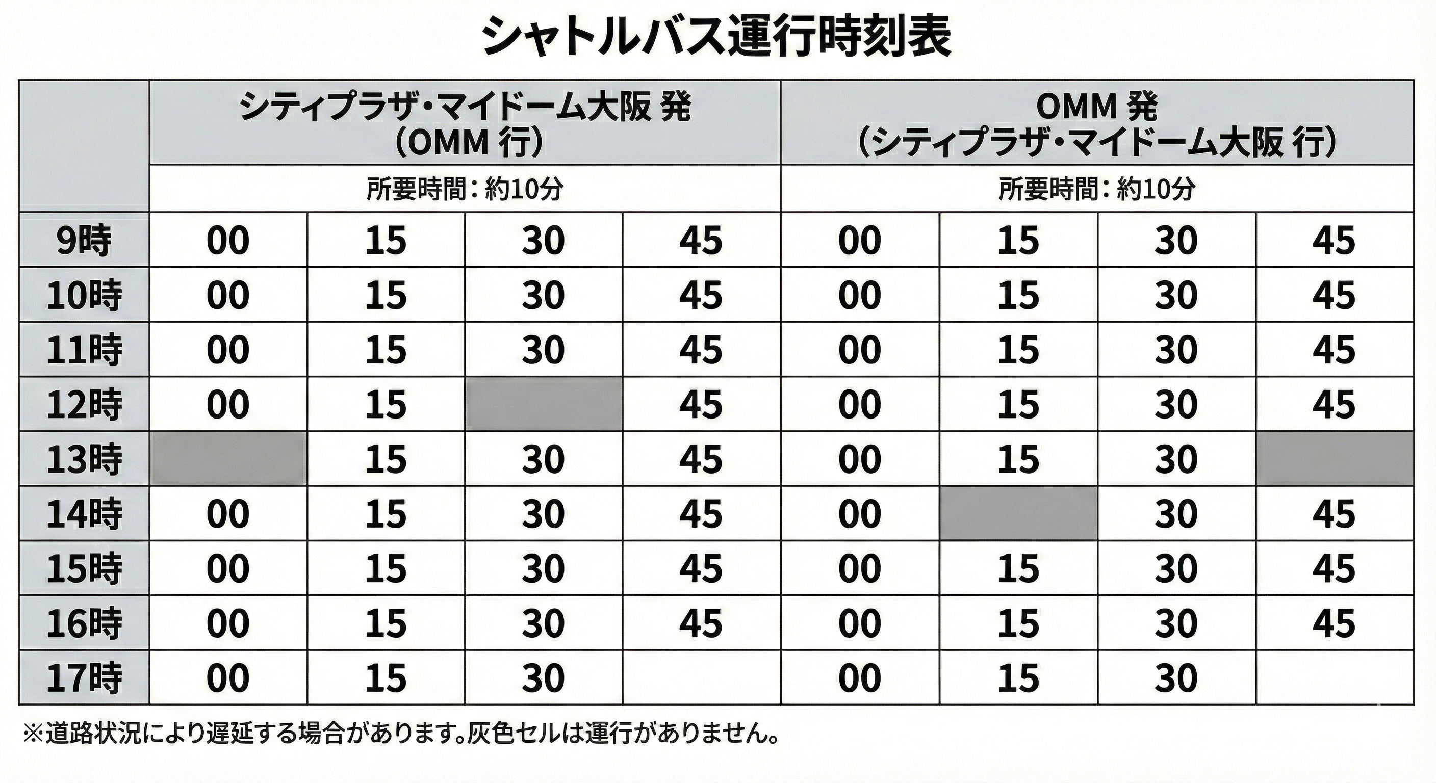 シャトルバスは、当イベント開催日のみ、以下の時刻にて運行を予定しております。